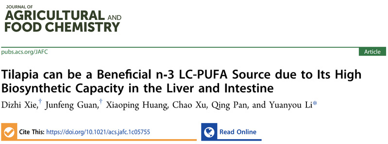 2月10日,我校海洋学院李远友教授课题组的研究论文“Tilapia can be a beneficial n-3 LC-PUFA source due to its high biosynthetic capacity in the liver and intestine”, 以封面文章在线发表于农学Top期刊 Journal of Agricultural and Food Chemistry(论文网址:https://pubs.acs.org/doi/full/10.1021/acs.jafc.1c05755)。