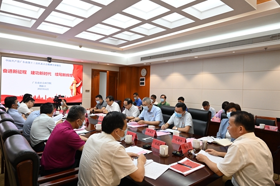 6月22日上午,学校举行党委理论学习中心组(扩大)学习会,专题学习省第十三次党代会精神。学习会以“深入学习贯彻省第十三次党代会精神,为广东在全面建设社会主义现代化国家新征程中走在全国前列、创造新的辉煌作出球服开云体育贡献”为主题,分专题辅导报告和集中学习研讨两个阶段进行。学习贯彻省第十三次党代会精神省委宣讲团成员、广东省社会科学院党组书记郭跃文受邀作专题辅导报告,校党委书记王斌伟主持会议并作总结讲话,校党委副书记、校长刘雅红、党委副书记邓国安、副校长仇荣亮作主旨发言,省党代表尹卓君作主题发言,其他中心组成员逐一作交流发言,省委教育工委组织处二级调研员陈瑞锋率指导组旁听指导。