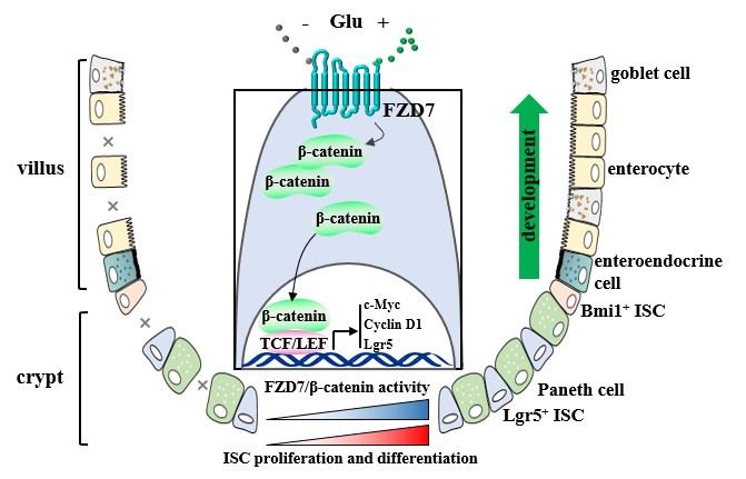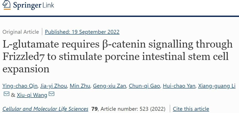 谷氨酸是食物和饲料中含量最丰富的氨基酸,对于促进肠道发育和健康具有重要功能。近日,我校动物科学学院、岭南现代农业科学与技术广东省实验室、广东省动物营养调控重点实验室、国家生猪种业工程技术研究中心王修启研究员团队在国际著名经典学术期刊Cellular and Molecular Life Sciences(影响因子10.002)上在线发表“L-glutamate requires β-catenin signalling through Frizzled7 to stimulate porcine intestinal stem cell expansion”的论文(链接https://link.springer.com/article/10.1007/s00018-022-04545-2 ),揭示胞外谷氨酸,与细胞膜上卷曲蛋白7(FZD7)受体结合,激活β-catenin,增强Wnt信号通路,提高肠道干细胞活性,促进肠上皮发育的新机制。