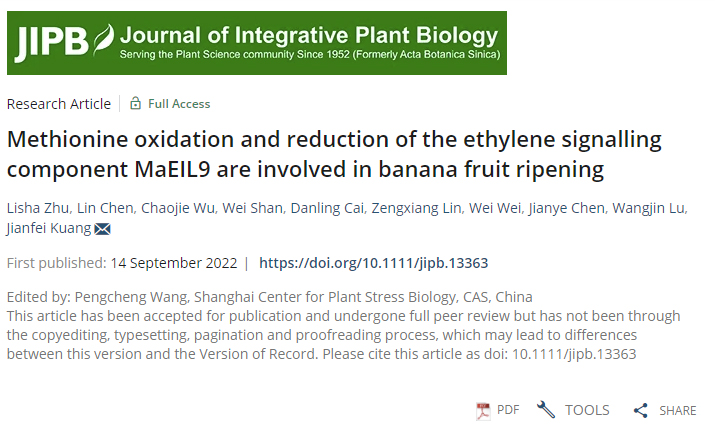 近日,我校亚热带农业生物资源保护与利用国家重点实验室、园艺学院陆旺金教授和陈建业教授课题组在国际知名期刊Journal of Integrative Plant Biology上发表题为“Methionine oxidation and reduction of the ethylene signalling component MaEIL9 are involved in banana fruit ripening”的研究论文。论文在线网址:https://onlinelibrary.wiley.com/doi/abs/10.1111/jipb.13363。
