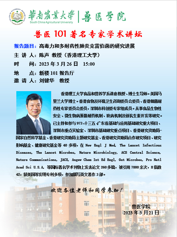 兽医101著名专家学术讲坛--高毒力和多耐药性肺炎克雷伯菌的研究进展