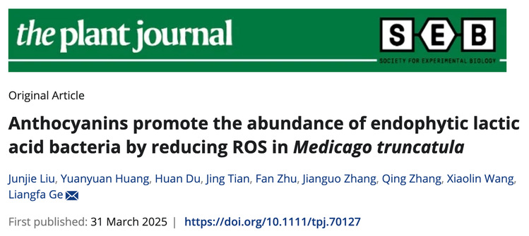 近日,农学院葛良法教授课题组在经典植物学杂志the Plant Journal上在线发表了题为“Anthocyanins promote the abundance of endophytic lactic acid bacteria by reducing ROS in Medicago truncatula”的研究论文。