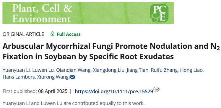 近日,资源环境学院根系生物学研究中心、亚热带农业生物资源保护与利用国家重点实验室王秀荣课题组在Plant, Cell & Environment发表了题为“Arbuscular mycorrhizal fungi promote nodulation and N2 fixation in soybean by specific root exudates”的研究论文,发现AM真菌通过诱导根系分泌特定的类黄酮和酚酸化合物促进大豆结瘤固氮。