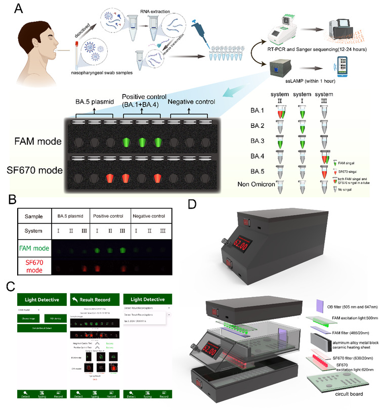 研究团队组通过创新引物设计思路,研究并建立了一种智能单环介导等温扩增技术(ssLAMP)。与传统LAMP方法不同,ssLAMP方法将引物组内一条环引物改造为线性引物,因此提供了更多的可放置SNP检测探针的区域。这种简化的引物组合也减少了引物组的复杂程度,使得多重检测的引物体系更容易实现,同时可以展现出与传统LAMP方法媲美的扩增效率和检测灵敏度。以新冠病毒S基因中不同的SNP位点作为检测靶标时,利用Rnase H2酶水解DNA-RNA复合体的特性,设计可识别对应SNP位点信息的检测探针,可以实现对新冠病毒奥密克戎变异株BA.1、BA.2、BA.3、BA.4和BA.5分支精准识别。进一步,为了实现ssLAMP对病原的现场化、智能化多重检测,研究人员研发了拥有恒温加热功能的FAM,SF670双荧光通道便携式检测设备,同时配套对应的结果智能分析手机APP,通过对不同反应管中不同荧光信号的HSV色域进行分析,可在1小时内实现对BA.1-BA.5不同变异株的精准智能多重检测。