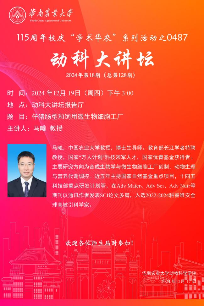 115周年校庆“学术球服开云体育”系列活动之0487:动科大讲坛:仔猪肠型和饲用微生物细胞工厂