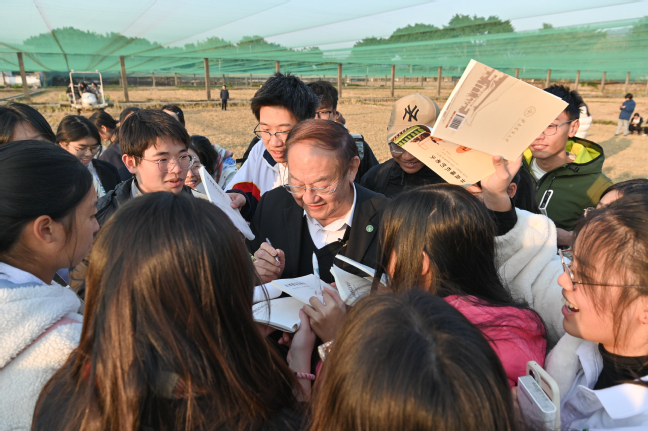 同学们对罗院士的人物小传《开直播机的老头》和智慧农机装备热力追捧,授课现场成了大型“追星”现场,争抢着与罗院士合影、要签名,并大呼“这堂课太酷了”“原来农业机械也可以这么高级”。2024级卢永根书院学员、生命科学学院生物科学基地班徐越同学表示:“穿梭在田地之间,我能感受到土地的力量,那些关于智能农机、无人农场的描述终于具象化地展示在我的眼前。未来我也要追随院士的脚步,挽裤赤脚走进田地间,做一个踏实肯干的新农人!”