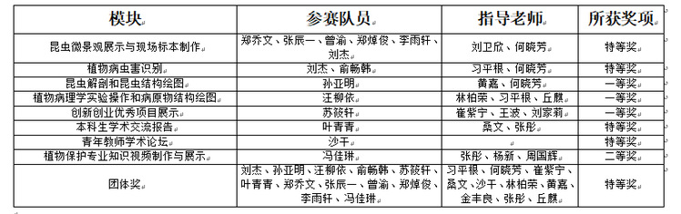 近日,第四届全国大学生植物保护专业能力大赛在福建农林大学顺利举办。我校蝉联团体特等奖、优秀组织奖,同时获得4个单项特等奖、3个单项一等奖等奖项,总成绩位居参赛学校第三,获奖数量和质量创历史新高。